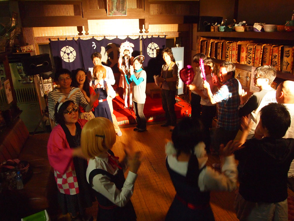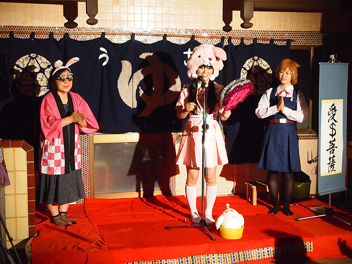 錦湯がモデルになったうさ湯にちなんだ「うさ湯音頭」を強制的に踊らされるお客さんたち。
